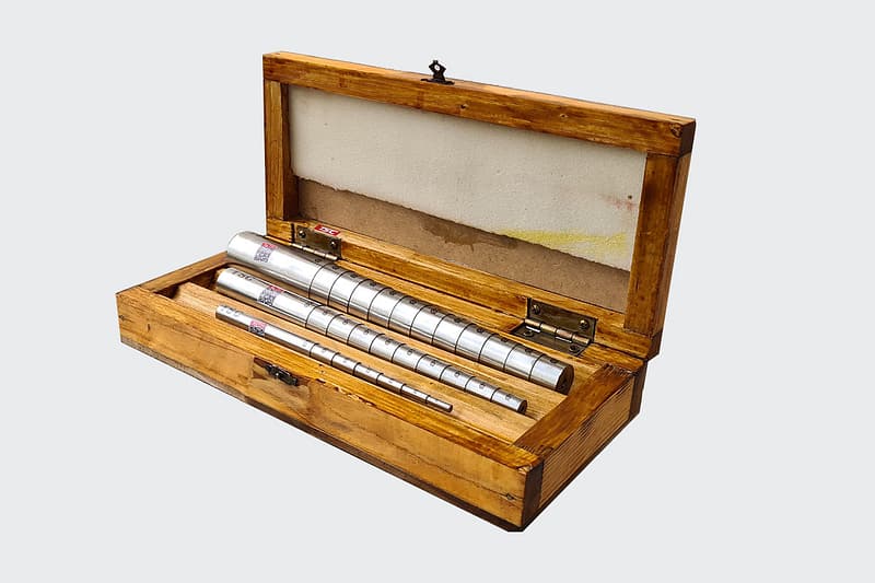 Box en bois contenant 03 jauges en Inox dégradés et numérotés pour contrôle des diamètres intérieurs.